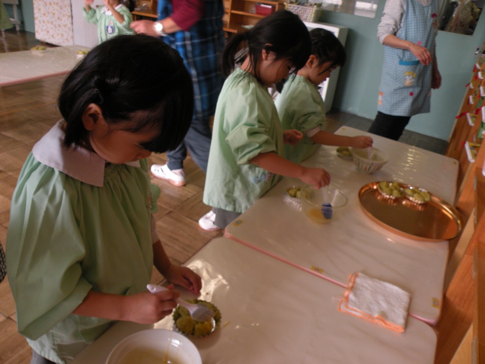 畑で収穫したサツマイモを使ってスイートポテトを作りました♪ 大鍋で茹でで、バター・砂糖・牛乳を入れて混ぜて、 コロコロ手で丸めて卵液を塗ってトースターでチン! みんなで収穫して、自分で作ったスイートポテトはとっても美味しかったね♪
