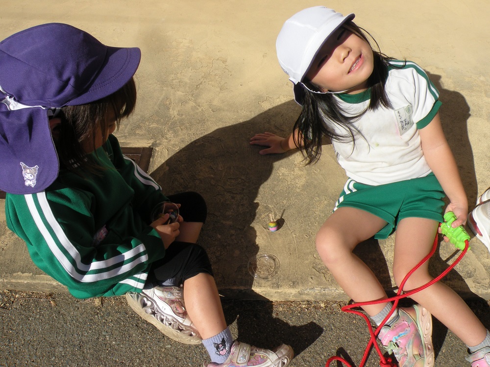 お散歩で拾ってきたどんぐりでコマを作ったよ~と見せてくれました!よく回るコマでした