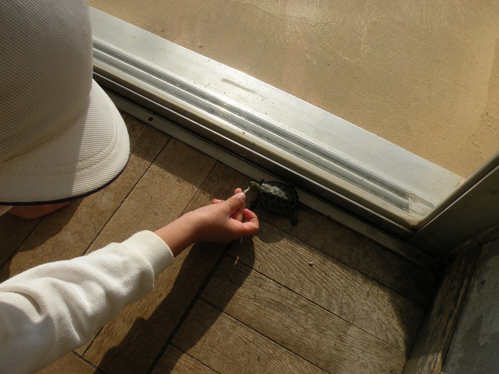 杉野幼稚園に新しい仲間が増えました!二ホンイシガメの『クラッシュ』です!今年の8月生まれでまだ3か月。今は頭からシッポの先までで10㎝ほどですが、大きくなると30㎝ほどになるそうです。餌をあげたり、横になって一緒に散歩したりして可愛がっています。ヤギのミミちゃんと同じように大切に育てていこうね!