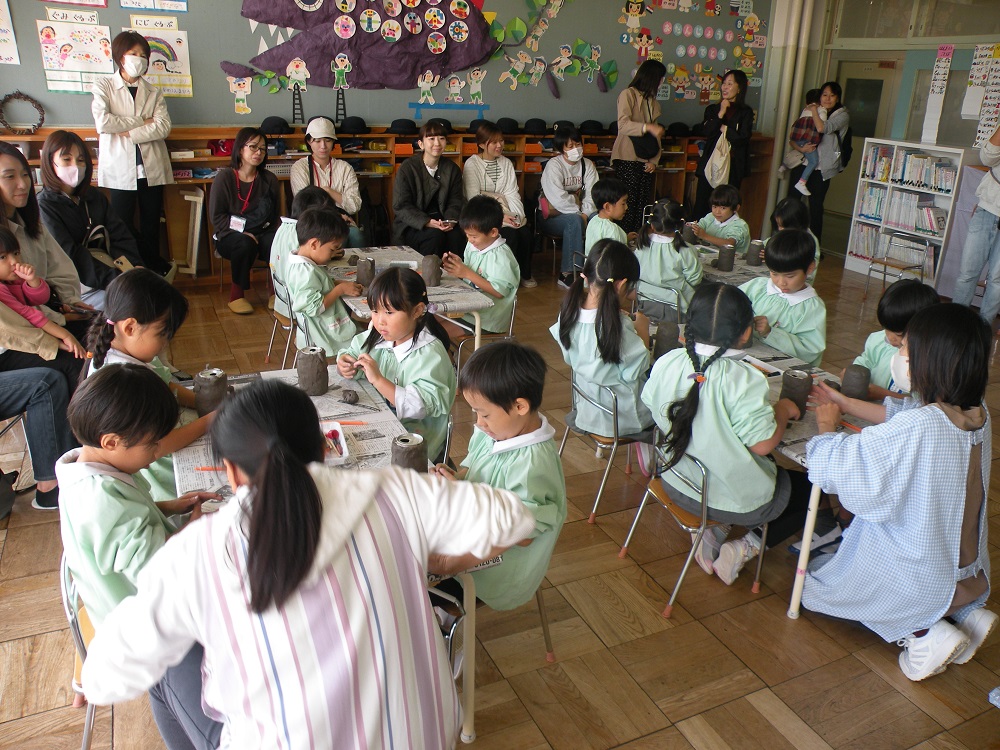 陶芸家の東先生のご指導の元、年長さんが陶芸にチャレンジしました! 土粘土の感触を楽しみながら、それぞれ工夫して個性豊かな作品が出来上がりました!東先生の窯で焼いていただき出来上がった作品は12/6(土)の作品展で飾ります!