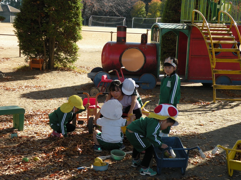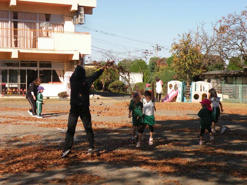 杉野幼稚園には大きなケヤキの木が沢山ありますが、ついこの間紅葉し始めたと思っていたら、風に吹かれて枯れ葉がひらひらと~。落ち葉は子ども達にとって魅力的な物♪ 落ち葉合戦をしたり、おままごとに使ったり、落ち葉でベッドを作ったり・・・遊びに取り入れて楽しんでいました~!